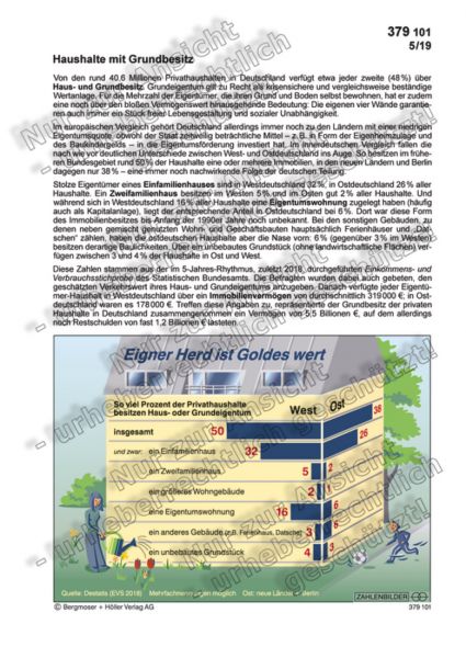 Diese Zahlen stammen aus der im 5-Jahres-Rhythmus, zuletzt 2018, durchgeführten Einkommens- und Verbrauchsstichprobe des Statistischen Bundesamts. Die Befragten wurden dabei auch gebeten, den geschätzten Verkehrswert ihres Haus- und Grundeigentums anzugeben. Danach verfügte jeder Eigentümer-Haushalt in Westdeutschland über ein Immobilienvermögen von durchschnittlich 319 000 €; in Ostdeutschland waren es 178 000 €. Treffen diese Angaben zu, repräsentierte der Grundbesitz der privaten Haushalte in Deutschland zusammengenommen ein Vermögen von 5,5 Billionen €, auf dem allerdings noch Restschulden von fast 1,2 Billionen € lasteten.