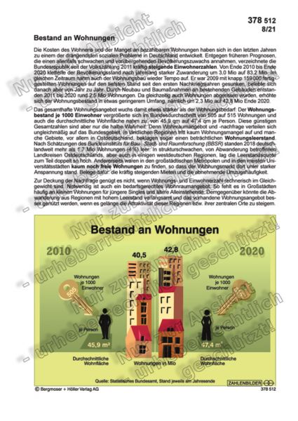 Die Kosten des Wohnens und der Mangel an bezahlbaren Wohnungen haben sich in den letzten Jahren zu einem der drängendsten sozialen Probleme in Deutschland entwickelt. Entgegen früheren Prognosen, die einen allenfalls schwachen und vorübergehenden Bevölkerungszuwachs annahmen, verzeichnete die Bundesrepublik seit der Volkszählung 2011 kräftig steigende Einwohnerzahlen. Von Ende 2010 bis Ende 2020 kletterte der Bevölkerungsstand nach jahrelang starker Zuwanderung um 3,0 Mio auf 83,2 Mio. Im gleichen Zeitraum nahm auch der Wohnungsbau wieder Tempo auf. Er war 2009 mit knapp 159 000 fertiggestellten Wohnungen auf den tiefsten Stand seit den ersten Nachkriegsjahren gesunken, belebte sich danach aber von Jahr zu Jahr. Durch Neubau und Baumaßnahmen an bestehenden Gebäuden entstanden 2011 bis 2020 rund 2,5 Mio Wohnungen. Da gleichzeitig auch Wohnungen abgerissen wurden, erhöhte sich der Wohnungsbestand in etwas geringerem Umfang, nämlich um 2,3 Mio auf 42,8 Mio Ende 2020.