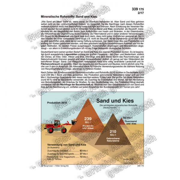 Nach Zahlen der Bundesanstalt für Geowissenschaften und Rohstoffe (BGR) wurden in Deutschland 2015 rund 239 Mio t Sand und Kies gewonnen. Die Produktion gebrochener Natursteine belief sich auf 210 Mio t. Hochwertige Quarzsande und -kiese machten weitere 10 Mio t aus. Der größte Teil dieser Materialien (rund 95 %) wird für Bauzwecke verwendet: als Zuschlag für Frischbeton und Mörtel, bei der Herstellung von Betonfertigteilen, als Unterbau für Straßen, für den Straßenbelag usw. Die Produktion hängt deshalb unmittelbar von der Nachfrage der Bauwirtschaft ab. Rechnet man den Gesamtverbrauch von Sand und Kies auf die Bevölkerung um, entfallen auf jeden Einwohner der Bundesrepublik 5,5 Tonnen pro Jahr!