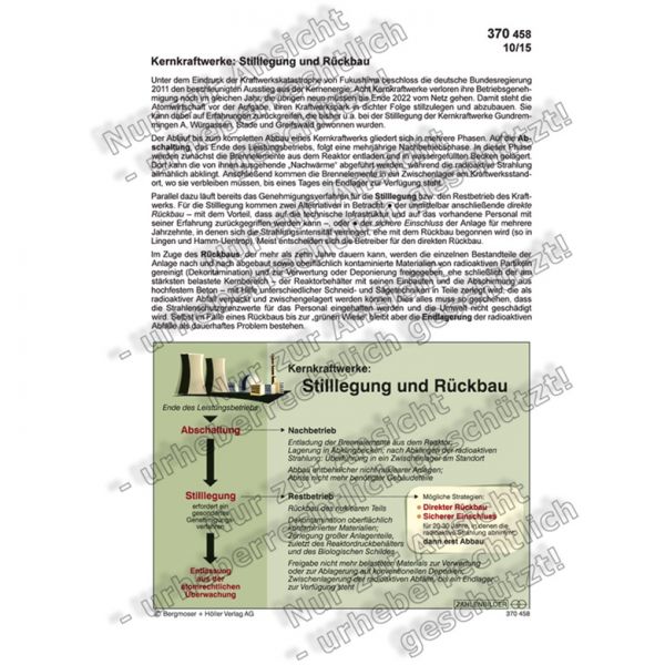Unter dem Eindruck der Kraftwerkskatastrophe von Fukushima beschloss die deutsche Bundesregierung 2011 den beschleunigten Ausstieg aus der Kernenergie: Acht Kernkraftwerke verloren ihre Betriebsgenehmigung noch im gleichen Jahr; die übrigen neun müssen bis Ende 2022 vom Netz gehen. Damit steht die Atomwirtschaft vor der Aufgabe, ihren Kraftwerkspark in dichter Folge stillzulegen und abzubauen. Sie kann dabei auf Erfahrungen zurückgreifen, die bisher u.a. bei der Stilllegung der Kernkraftwerke Gundremmingen A, Würgassen, Stade und Greifswald gewonnen wurden.