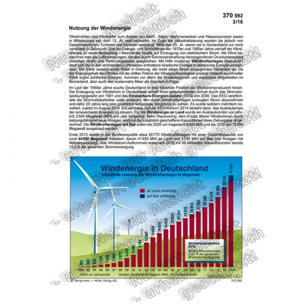 Windmühlen und Windräder zum Antrieb von Mahl-, Säge-, Hammerwerken und Wasserpumpen waren in Mitteleuropa seit dem 13. Jh. weit verreitet. Im Zuge der Industrialisierung wurden sie jedoch von Dampfmaschinen, Turbinen und Motoren verdrängt. Mitte des 20 Jh. waren sie in Deutschland nur noch vereinzelt in Gebrauch. Erst die Energie- und Umweltkrise der 1970er und 1980er Jahre verhalf der Windenergie zu neuer Bedeutung – diesmal als Quelle zur Erzeugung von elektrischem Strom.