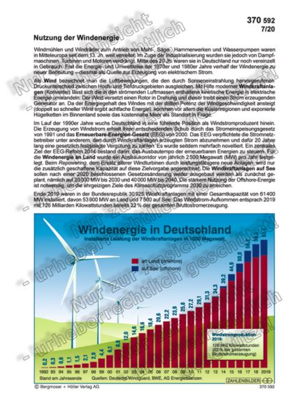Ende 2019 waren in der Bundesrepublik 30 925 Windkraftanlagen mit einer Gesamtkapazität von 61 400 MW installiert, davon 53 900 MW an Land und 7 500 auf See. Das Windstrom-Aufkommen entsprach 2019 mit 126 Milliarden Kilowattstunden bereits 22 % der gesamten Bruttostromerzeugung.
