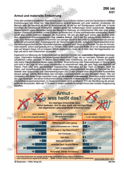 Ergänzend zur Messung der Einkommensarmut wird das Konzept der materiellen Deprivation herangezogen. Deprivation bedeutet den erzwungenen Verzicht auf Dinge, die zur normalen Teilhabe am gesellschaftlichen Leben gehören. In diesem Sinne leidet unter Entbehrung, wer sich z.B. keinen Fernseher oder keine Waschmaschine leisten kann, mit Miete, Stromrechnung oder Ratenzahlungen in Verzug gerät und nicht in der Lage ist, eine kurze Urlaubsreise zu unternehmen oder alle zwei Tage eine Mahlzeit mit Fleisch, Fisch oder einer gleichwertigen vegetarischen Alternative auf den Tisch zu bringen. Auch die Wohn- und Umweltsituation kann einen eingeschränkten Lebensstandard verraten. Im Rahmen der EUStatistik über Einkommen und Lebensbedingungen (SILC) wird anhand einer 13-Punkte-Auswahlliste danach gefragt, welche Bestandteile des normalen Lebensstandards bei den Befragten fehlen. Wer auf mindestens fünf dieser Dinge verzichten muss, gilt als materiell unterversorgt. Besonders prekär erscheint die Lage derjenigen, bei denen Einkommensarmut, materielle Entbehrung und sehr geringe Teilnahme am Arbeitsleben zusammenkommen. In Deutschland waren 2023 rund 21 % der Bevölkerung (17,7 Mio Menschen) von Armut oder ernsthafter materieller und sozialer Entbehrung betroffen. EU-weit waren es 95,3 Mio (2022). Die EU hat sich zum Ziel gesetzt, diese Zahl bis 2030 um 15 Millionen zu verringern.