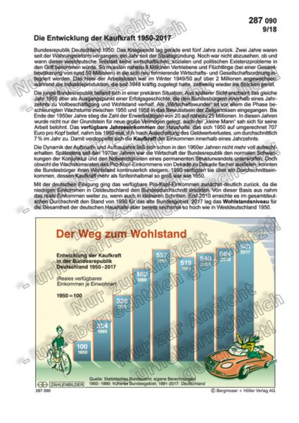 Die junge Bundesrepublik befand sich in einer prekären Situation. Aus späterer Sicht erscheint das gleiche Jahr 1950 aber als Ausgangspunkt einer Erfolgsgeschichte, die den Bundesbürgern innerhalb eines Jahrzehnts zu Vollbeschäftigung und Wohlstand verhalf. Als „Wirtschaftswunder“ ist vor allem die Phase beschleunigten Wachstums zwischen 1950 und 1958 in das Bewusstsein der Zeitgenossen eingegangen. Bis Ende der 1950er Jahre stieg die Zahl der Erwerbstätigen von 20 auf nahezu 25 Mio. In diesen Jahren wurde nicht nur der Grundstein für neue große Vermögen gelegt, auch der „kleine Mann“ sah sich für seine Arbeit belohnt. Das verfügbare Jahreseinkommen der Haushalte, das sich 1950 auf umgerechnet 712 Euro pro Kopf belief, nahm bis 1960 real, d.h. nach Ausschaltung des Geldwertverlustes, um durchschnittlich 7% im Jahr zu. Damit verdoppelte sich die Kaufkraft der Einkommen innerhalb eines Jahrzehnts.