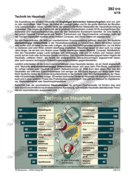 Die Ausstattung der privaten Haushalte mit langlebigen technischen Gebrauchsgütern wird von Jahr zu Jahr reichhaltiger. Viele Dinge, die früher als Luxusgut galten und für die große Mehrheit der Bevölkerung unerschwinglich waren, werden heute als selbstverständlicher Bestandteil der Haushaltseinrichtung angesehen. Das zeigen die Ergebnisse der in größeren Zeitabständen (zuletzt 2018) durchgeführten Einkommens- und Verbrauchsstichprobe, über die das Statistische Bundesamt berichtet. So sind heute in fast jedem Haushalt Fernsehgerät und Telefon, Kühlschrank und Waschmaschine vorhanden; mehr als vier von fünf Haushalten besitzen einen mobilen Computer, drei Viertel haben ein eigenes Auto.