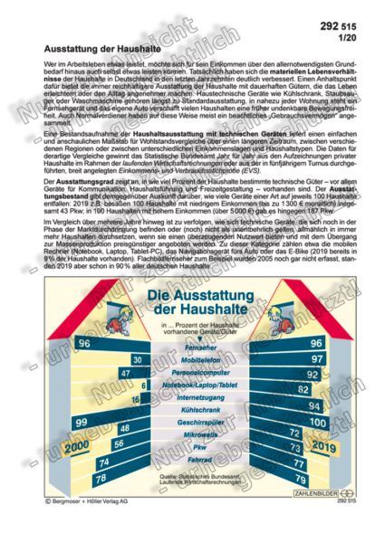 Wer im Arbeitsleben etwas leistet, möchte sich für sein Einkommen über den allernotwendigsten Grundbedarf hinaus auch selbst etwas leisten können. Tatsächlich haben sich die materiellen Lebensverhältnisse der Haushalte in Deutschland in den letzten Jahrzehnten deutlich verbessert. Einen Anhaltspunkt dafür bietet die immer reichhaltigere Ausstattung der Haushalte mit dauerhaften Gütern, die das Leben erleichtern oder den Alltag angenehmer machen. Haustechnische Geräte wie Kühlschrank, Staubsauger oder Waschmaschine gehören längst zu Standardausstattung, in nahezu jeder Wohnung steht ein Fernsehgerät und das eigene Auto verschafft vielen Haushalten eine früher undenkbare Bewegungsfreiheit. Auch Normalverdiener haben auf diese Weise meist ein beachtliches „Gebrauchsvermögen“ angesammelt.
