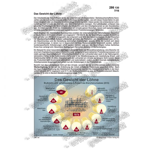 Nach Angaben des Statistischen Bundesamtes erzielten die Unternehmen des Verarbeitenden Gewerbes in Deutschland 2015 einen Umsatz von insgesamt 1785 Mrd €. An die Beschäftigten wurden Bruttolöhne und -gehälter von 285 Mrd € ausgezahlt; das entsprach rund 16 % des Gesamtumsatzes. Zu den Branchen mit überdurchschnittlich hohem Lohnanteil gehörten die Produktion von Metallerzeugnissen (23 %), der Maschinenbau und die Herstellung elektrischer Ausrüstungen (jeweils 22 %). Es handelt sich dabei um Industriezweige, in denen nur in begrenztem Umfang Massenprodukte hergestellt werden, vielfach kundenspezifische Anforderungen erfüllt werden müssen und von den Beschäftigten hohes fachliches Know-how verlangt wird. Besondere Bedingungen herrschen daneben im Kohlenbergbau
