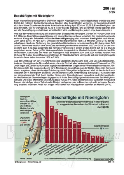 Wie aus der Verdiensterhebung des Statistischen Bundesamts hervorgeht, wurden im Frühjahr 2024 rund 6,3 Millionen Beschäftigungsverhältnisse mit einem Stundenverdienst unterhalb der Niedriglohnschwelle entlohnt. Knapp ein Sechstel (16%) aller Beschäftigten ging also mit einem Niedriglohn nach Hause. Zehn Jahre zuvor, im April 2014, umfasste der Niedriglohnsektor noch 7,6 Millionen Jobs (21 % der Beschäftigten). Nach der Einführung des gesetzlichen Mindestlohns zum Jahresanfang 2015 ging diese Zahl zurück. Besonders deutlich sank die Quote der Niedriglohnbezieher zwischen 2022 und 2023, da der Mindestlohn zum 1.10.2022 außerhalb des normalen Verfahrens in einem großen Schritt auf 12 € je Stunde angehoben wurde. Seine größte Wirkung entfaltete der gesetzliche Mindestlohn in den ostdeutschen Flächenländern. Dort wurde der Anteil der Niedriglohn-Jobs zwischen 2014 und 2024 nahezu halbiert: von 35 % auf 18 % aller Beschäftigungsverhältnisse. In Westdeutschland verringerte sich die Niedriglohnquote innerhalb dieser zehn Jahre von 19 % auf 16 %.