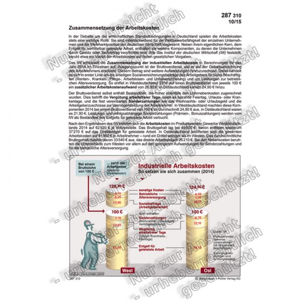 Nach den Ergebnissen des IW beliefen sich die Arbeitskosten im Produzierenden Gewerbe Westdeutschlands 2014 auf 62920 € je Vollzeitstelle. Das Bruttogehalt lag bei 49600 €; davon entfielen wiederum 37270 € auf das Direktentgelt für geleistete Arbeit. In Ostdeutschland bezifferten sich die gesamten Arbeitskosten auf 41900 € je Arbeitnehmer – rund ein Drittel weniger als im Westen. Das durchschnittliche Bruttogehalt machte davon 33540 € aus, das direkte Arbeitsentgelt 26210 €. Bei den Nebenkosten beruhten die Unterschiede zum Westen vor allem auf den geringeren Aufwendungen für Sonderzahlungen und für die betriebliche Altersversorgung.