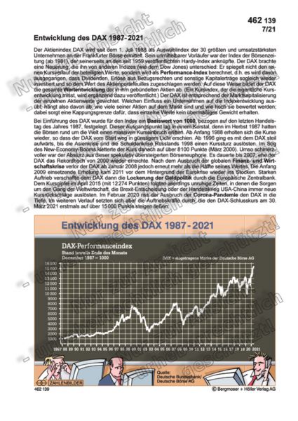 Das ZAHLENBILD zeichnet die Entwicklung des Deutschen Aktienindex DAX von seinen Anfängen im Jahr 1988 bis in die Gegenwart nach: Lohnendes Material für den Wirtschaftskundeunterricht! Laden Sie es jetzt herunter.