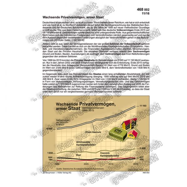 In den Jahren 1999 bis 2023 konnten die Privaten Haushalte ihr Reinvermögen von 6471 auf 19185 Mrd € steigern. Nur in der Finanzkrise 2008 gab es einen leichten Rückschlag. Ende 2023 verfügten die Haushalte über Anlagegüter (hauptsächlich Bauten) im Wert von 7871 Mrd €, Grund und Boden im Wert von 4653 Mrd € sowie Geldvermögen von 8823 Mrd €, dem Verbindlichkeiten von 2162 Mrd € gegenüberstanden. Das Gebrauchsvermögen der Haushalte (Einrichtung, Autos, Schmuck usw.), 2023 im Wert von 1171 Mrd €, ist in der Bilanz nicht einmal enthalten.
