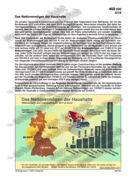 Nach den Ergebnissen der Bundesbank-Studie hatten die deutschen Privathaushalte 2021 im Durchschnitt ein Bruttovermögen von 346 500 € und ein Nettovermögen (nach Abzug der Schulden) von 316 500 € zur Verfügung. Wegen der Ungleichverteilung der Vermögen sind die Durchschnittswerte allerdings nicht sehr aussagekräftig. Besser geeignet ist der Medianwert, der die Haushalte in eine ärmere und eine reichere Hälfte teilt: Er belief sich 2021 auf 121 900 € für das Bruttovermögen und 106 600 € für das Nettovermögen. Das heißt: die eine Hälfte der Haushalte besaß weniger, die andere mehr als diesen Betrag. Von den untersten 20 % der Haushalte verfügte die Hälfte über ein Nettovermögen von weniger als 900 €. Auf der anderen Seite hatte die Hälfte der vermögendsten 10 % der Haushalte Sach- und Finanzwerte von mehr als 1,1 Mio € in ihrem Besitz. Gegenüber der Befragung von 2017 profitierten Hauseigentümer von steigenden Immobilienwerten und konnten so ihr Vermögen deutlich steigern.
