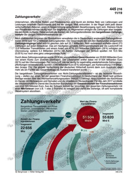Durch die Zahlungsvorgänge wurde 2023 eine Gesamtsumme von 69 771 Milliarden Euro von einem Konto zum anderen übertragen. Der Löwenanteil entfiel dabei mit 63 619 Mrd Euro (91 %) auf die Überweisungen. Per Lastschrift, wie sie häufig für regelmäßig wiederkehrende Zahlungsverpflichtungen verwendet wird, wurden 5 430 Milliarden Euro (8 %) übertragen, per Kartenzahlung 540 Milliarden Euro (0,8 %). Die globale Verflechtung der deutschen Wirtschaft kommt darin zum Ausdruck, dass fast ein Fünftel des Gesamtbetrags ins Ausland transferiert wurde.