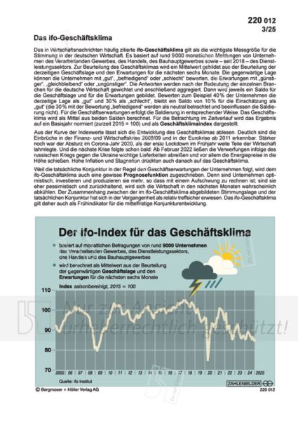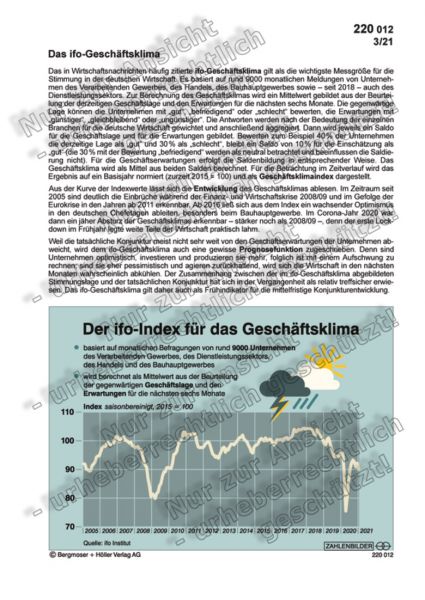 Das in Wirtschaftsnachrichten häufig zitierte ifo-Geschäftsklima gilt als die wichtigste Messgröße für die Stimmung in der deutschen Wirtschaft. Es basiert auf rund 9000 monatlichen Meldungen von Unternehmen des Verarbeitenden Gewerbes, des Handels, des Bauhauptgewerbes sowie – seit 2018 – des Dienstleistungssektors. Zur Beurteilung des Geschäftsklimas wird ein Mittelwert gebildet aus der Beurteilung der derzeitigen Geschäftslage und den Erwartungen für die nächsten sechs Monate. Die gegenwärtige Lage können die Unternehmen mit „gut“, „befriedigend“ oder „schlecht“ bewerten, die Erwartungen mit „günstiger“, „gleichbleibend“ oder „ungünstiger“. Die Antworten werden nach der Bedeutung der einzelnen Branchen für die deutsche Wirtschaft gewichtet und anschließend aggregiert. Dann wird jeweils ein Saldo für die Geschäftslage und für die Erwartungen gebildet. Bewerten zum Beispiel 40% der Unternehmen die derzeitige Lage als „gut“ und 30% als „schlecht“, bleibt ein Saldo von 10% für die Einschätzung als „gut“ (die 30% mit der Bewertung „befriedigend“ werden als neutral betrachtet und beeinflussen die Saldierung nicht). Für die Geschäftserwartungen erfolgt die Saldierung in entsprechender Weise. Das Geschäftsklima wird als Mittel aus beiden Salden berechnet. Für die Betrachtung im Zeitverlauf wird das Ergebnis auf ein Basisjahr normiert (zurzeit 2015 = 100) und als Geschäftsklimaindex dargestellt.