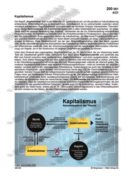 Der Begriff „Kapitalismus“ kam in der Mitte des 19. Jahrhunderts auf, um die parallel zur Industrialisierung entstandene Wirtschaftsordnung zu kennzeichnen. Grundsätzlich ist zu unterscheiden zwischen einem moralisch anklagenden Begriffsgebrauch und einer mehr an wertfreier Analyse interessierten Theoriebildung. Einige Kernmerkmale des Kapitalismus lassen sich in allen Interpretationen ausmachen. An erster Stelle steht die zentrale Bedeutung des „Kapitals“, verstanden als die zur Güterherstellung erforderlichen Produktionsmittel. Im Kapitalismus befinden sich die Produktionsmittel in Privateigentum, also in den Händen der Unternehmen. Ihnen gegenüber stehen die Arbeitnehmer, die über keine Produktionsmittel verfügen und ihre Arbeitskraft wie eine Ware am freien Markt verkaufen müssen, um ihren Lebensunterhalt bestreiten zu können. Freie Marktwirtschaft, bei der das Wirtschaftsgeschehen über den Markt reguliert wird, ist also ebenfalls ein typisches Kennzeichen des Kapitalismus. Weitere Merkmale sind das Profitstreben der Unternehmen sowie die Ziele der Gewinnmaximierung und der beständigen Akkumulation (Vermehrung) von Kapital, um in der Konkurrenz mit anderen Unternehmen bestehen zu können.