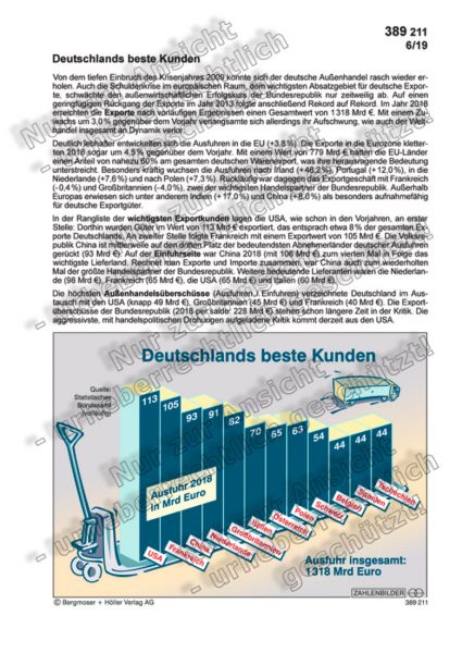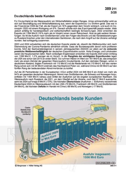 2023 und 2024 schwächten sich die deutschen Exporte wieder ab, obwohl die Weltkonjunktur sich nach Überwindung der Corona-Pandemie allmählich erholte. Dass die Bundesrepublik davon nicht profitieren konnte, führt der Sachverständigenrat in seinem Jahresgutachten 2024/25 vor allem auf die sinkende preisliche Wettbewerbsfähigkeit der deutschen Exportindustrie zurück. Hohe Energie- und Lohnkosten waren die Hauptursachen dafür. Nach vorläufigen Ergebnissen erreichten die Exporte 2024 einen Umfang von 1 556 Mrd €, 1,2 % weniger als im Vorjahr. In der Rangliste der wichtigsten Exportkunden lagen die USA wie schon seit 2015 an erster Stelle. Sie nahmen Waren im Wert von 161 Mrd € ab; das entsprach mehr als einem Zehntel der gesamten Warenausfuhr Deutschlands. Auf den nächsten Rängen, schon in deutlichem Abstand, folgten Frankreich mit 116 Mrd € und die Niederlande mit 110 Mrd €. Auf den vierten Rang schob sich mit 94 Mrd € erstmals das Nachbarland Polen vor, während China mit 90 Mrd € auf den fünften Rang der bedeutendsten Abnehmerländer zurückfiel.
