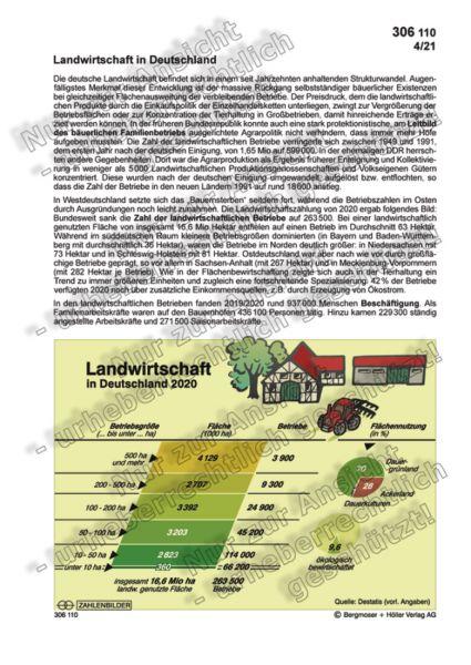In Westdeutschland setzte sich das „Bauernsterben“ seitdem fort, während die Betriebszahlen im Osten durch Ausgründungen noch leicht zunahmen. Die Landwirtschaftszählung von 2020 ergab folgendes Bild: Bundesweit sank die Zahl der landwirtschaftlichen Betriebe auf 263 500. Bei einer landwirtschaftlich genutzten Fläche von insgesamt 16,6 Mio Hektar entfielen auf einen Betrieb im Durchschnitt 63 Hektar. Während im süddeutschen Raum kleinere Betriebsgrößen dominierten (in Bayern und Baden-Württemberg mit durchschnittlich 36 Hektar), waren die Betriebe im Norden deutlich größer: in Niedersachsen mit 73 Hektar und in Schleswig-Holstein mit 81 Hektar. Ostdeutschland war aber nach wie vor durch großflächige Betriebe geprägt, so vor allem in Sachsen-Anhalt (mit 267 Hektar) und in Mecklenburg-Vorpommern (mit 282 Hektar je Betrieb). Wie in der Flächenbewirtschaftung zeigte sich auch in der Tierhaltung ein Trend zu immer größeren Einheiten und zugleich eine fortschreitende Spezialisierung. 42 % der Betriebe verfügten 2020 noch über zusätzliche Einkommensquellen, z. B. durch Erzeugung von Ökostrom.
