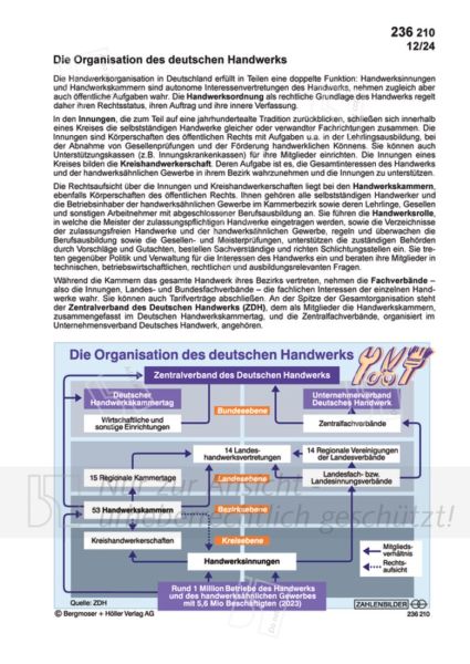 Das deutsche Handwerk (einschließlich der handwerksähnlichen Gewerbe) umfasst etwa 1 Million Betriebe mit weit über 5 Millionen Beschäftigten. Es verfügt mit Innungen und Handwerkskammern über Einrichtungen, die seine Interessen vertreten, zugleich aber auch öffentliche Aufgaben wahrnehmen. Mehr über den organisatorischen Stufenbau des Handwerks in diesem ZAHLENBILD!