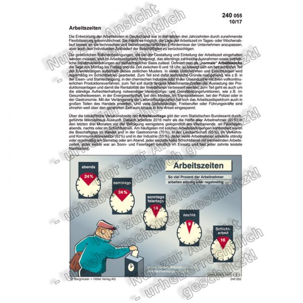 Die gesetzlichen Rahmenbedingungen, die bei der Gestaltung und Einteilung der Arbeitszeit eingehalten werden müssen, sind im Arbeitszeitgesetz festgelegt, das allerdings zahlreiche Ausnahmen sowie betriebliche Sondervereinbarungen auf tarifvertraglicher Basis zulässt. Definiert man als „normale“ Arbeitswoche die Tage von Montag bis Freitag und die Zeit zwischen 6 und 18 Uhr, so bewegt sich ein beträchtlicher Teil der Erwerbstätigen außerhalb dieses zeitlichen Musters. In vielen Unternehmen und Einrichtungen wird regelmäßig im Schichtbetrieb gearbeitet. Zum Teil sind dafür technische Gründe maßgebend, wie z.B. in der Eisen- und Stahlerzeugung, in der chemischen Industrie oder in der Glasindustrie mit ihren vollkontinuierlichen Produktionsverfahren; zum Teil soll durch längere Maschinenlaufzeiten die Auslastung der Produktionsanlagen und damit die Rentabilität der Investitionen verbessert werden; zum Teil geht es auch um die ständige Aufrechterhaltung notwendiger Versorgungs- und Dienstleistungsfunktionen, wie z.B. im Gesundheitswesen, in der Energiewirtschaft, bei den Medien, im Transportwesen, bei der Polizei oder in der Gastronomie. Mit der Verlängerung der Ladenöffnungszeiten hat sich das Arbeitszeitspektrum auch in großen Teilen des Handels erweitert. Und viele Selbstständige, Freiberufler oder Führungskräfte sind ohnehin weit über den genannten Zeitraum hinaus in ihre Arbeit eingespannt.