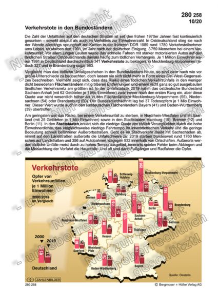 Vergleicht man das tödliche Unfallgeschehen in den Bundesländern heute, so sind zwar nach wie vor große Unterschiede zu beobachten, doch lassen sie sich nicht mehr in Form eines Ost-West-Gegensatzes beschreiben. Vielmehr zeigt sich, dass das Risiko eines tödlichen Verkehrsunfalls in den weniger dicht besiedelten Flächenländern mit größeren Entfernungen und einem nicht ganz so gut ausgebauten ländlichen Verkehrsnetz am größten ist.