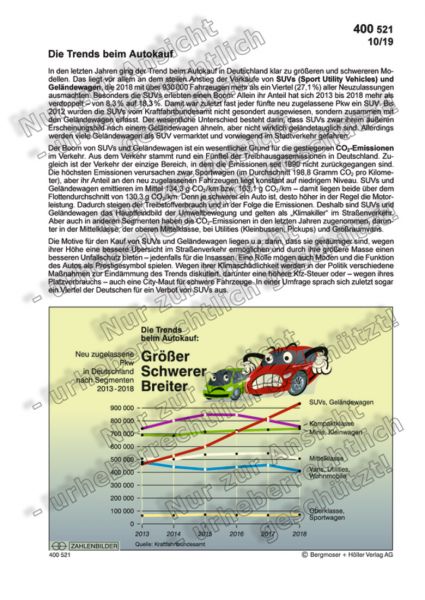 In den letzten Jahren ging der Trend beim Autokauf in Deutschland klar zu größeren und schwereren Modellen. Das liegt vor allem an dem steilen Anstieg der Verkäufe von SUVs (Sport Utility Vehicles) und Geländewagen, die 2018 mit über 930 000 Fahrzeugen mehr als ein Viertel (27,1 %) aller Neuzulassungen ausmachten. Besonders die SUVs erlebten einen Boom: Allein ihr Anteil hat sich 2013 bis 2018 mehr als verdoppelt – von 8,3 % auf 18,3 %. Damit war zuletzt fast jeder fünfte neu zugelassene Pkw ein SUV. Bis 2012 wurden die SUVs vom Kraftfahrtbundesamt nicht gesondert ausgewiesen, sondern zusammen mit den Geländewagen erfasst. Der wesentliche Unterschied besteht darin, dass SUVs zwar ihrem äußeren Erscheinungsbild nach einem Geländewagen ähneln, aber nicht wirklich geländetauglich sind. Allerdings werden viele Geländewagen als SUV vermarktet und vorwiegend im Stadtverkehr gefahren.
