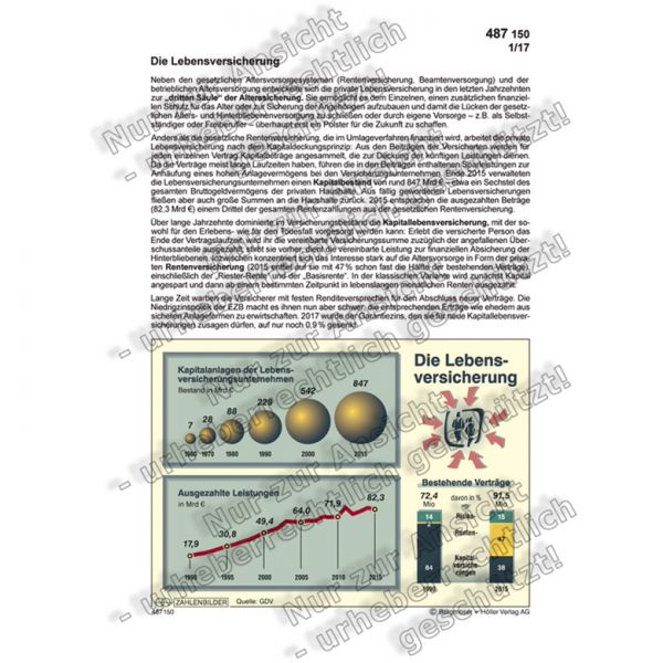 Anders als die gesetzliche Rentenversicherung, die überwiegend im Umlageverfahren finanziert wird, arbeitet die private Lebensversicherung nach dem Kapitaldeckungsprinzip: Aus den Beiträgen der Versicherten werden für jeden einzelnen Vertrag Kapitalbeiträge angesammelt, die zur Deckung der künftigen Leistungen dienen. Da die Verträge meist lange Laufzeiten haben, führen die in den Beiträgen enthaltenen Sparleistungen zur Anhäufung eines hohen Anlagevermögens bei den Versicherungsunternehmen. So verwalteten die Lebensversicherungsunternehmen Ende 2023 einen Kapitalbestand von rund 1026 Mrd € – knapp ein Siebtel des gesamten Bruttogeldvermögens der privaten Haushalte. Aus fällig gewordenen Lebensversicherungen fließen aber auch große Summen an die Haushalte zurück. 2023 entsprachen die ausgezahlten Beträge (96,6 Mrd €) einem Viertel der gesamten Rentenzahlungen aus der gesetzlichen Rentenversicherung.