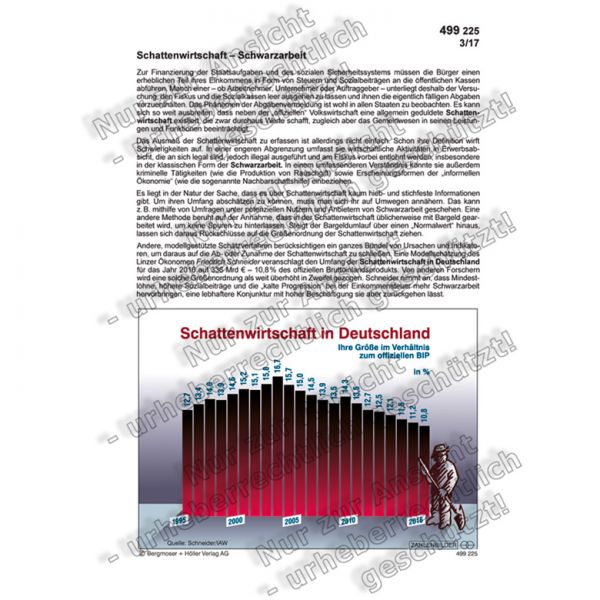 Schwarzarbeit und Schattenwirtschaft hinterlassen kaum statistisch verwertbare Spuren. Das liegt in der Natur der Sache. Aber es gibt Schätzmethoden, um ihre Größenordnung zu erfassen. Das ZAHLENBILD präsentiert das Ergebnis solcher Schätzungen ab dem Jahr 2000: Wie groß ist die Schattenwirtschaft im Verhältnis zum offiziellen Bruttoinlandsprodukt?