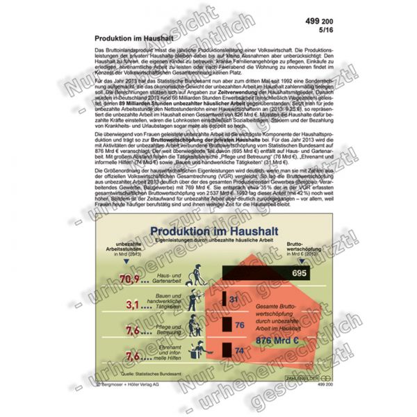 Für das Jahr 2013 hat das Statistische Bundesamt nun aber zum dritten Mal seit 1992 eine Sonderrechnung aufgemacht, die das ökonomische Gewicht der unbezahlten Arbeit im Haushalt zahlenmäßig belegen soll. Die Berechnungen stützen sich auf Angaben zur Zeitverwendung der Haushaltsmitglieder. Danach wurden in Deutschland 2013 rund 66 Milliarden Stunden Erwerbsarbeit (einschließlich Wegezeiten) geleistet, denen 89 Milliarden Stunden unbezahlter häuslicher Arbeit gegenüberstanden. Setzt man für jede unbezahlte Arbeitsstunde den Nettostundenlohn einer Hauswirtschafterin an (2013: 9,25 €), so repräsentiert die unbezahlte Arbeit im Haushalt einen Gesamtwert von 826 Mrd €. Müssten die Haushalte dafür bezahlte Kräfte einstellen, wären die Lohnkosten einschließlich Sozialbeiträgen, Steuern und der Bezahlung von Krankheits- und Urlaubstagen sogar mehr als doppelt so hoch.