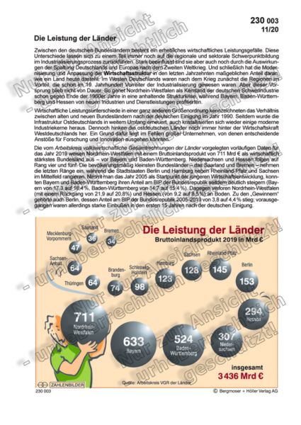 Zwischen den deutschen Bundesländern besteht ein erhebliches wirtschaftliches Leistungsgefälle. Diese Unterschiede lassen sich zu einem Teil immer noch auf die regionale und sektorale Schwerpunktbildung im Industrialisierungsprozess zurückführen. Stark beeinflusst sind sie aber auch noch durch die Auswirkungen der Spaltung Deutschlands und Europas nach dem Zweiten Weltkrieg. Und schließlich hat die Modernisierung und Anpassung der Wirtschaftsstruktur in den letzten Jahrzehnten maßgeblichen Anteil daran, wie ein Land heute dasteht. Im Westen Deutschlands waren nach dem Krieg zunächst die Regionen im Vorteil, die schon im 19. Jahrhundert Vorreiter der Industrialisierung gewesen waren. Aber dieser Vorsprung blieb nicht von Dauer. So geriet Nordrhein-Westfalen als Kernland der deutschen Schwerindustrie schon gegen Ende der 1960er Jahre in eine anhaltende Strukturkrise, während Bayern, Baden-Württemberg und Hessen von neuen Industrien und Dienstleistungen profitierten.