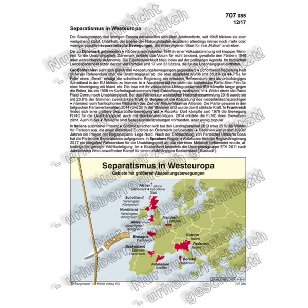 Großbritannien sieht sich gleich drei Abspaltungsbewegungen gegenüber: • Schottlands Regierung hielt 2014 ein Referendum über die Unabhängigkeit ab, die aber abgelehnt wurde (mit 55,3 % zu 44,7 %). Im Falle eines „Brexit“ erwägt die schottische Regierung ein erneutes Referendum, um als unabhängiges Schottland in der EU bleiben zu können. In • Nordirland tritt vor allem die katholische Partei Sinn Féin für eine Vereinigung mit Irland ein. Die lose mit ihr verbundene Untergrundarmee IRA kämpfte lange gegen die Briten, bis sie 1998 im Karfreitagsabkommen ihrer Entwaffnung zustimmte. In • Wales strebt die Partei Plaid Cymru nach Unabhängigkeit. Bei den Wahlen zur walisischen Nationalversammlung 2016 wurde sie mit 20,8 % der Stimmen zweitstärkste Kraft. In Belgien ist die Abspaltung des niederländischsprachigen • Flandern vom frankophonen Wallonien das Ziel der Nieuw-Vlaamse Alliantie. Die Partei gewann in den belgischen Parlamentswahlen 2014 rund 20 % der Stimmen und wurde damit stärkste Kraft. In Frankreich findet sich eine größere Separatistenbewegung auf • Korsika: Dort kämpfte seit 1976 die Bewegung FLNC für die Unabhängigkeit, auch mit Bombenanschlägen. 2014 erklärte die FLNC ihren Gewaltverzicht. Auch in der • Bretagne sind Sezessionsbestrebungen vorhanden, aber wenig populär.