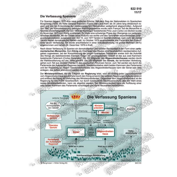Nach dieser Verfassung ist Spanien ein demokratischer und sozialer Rechtsstaat in der Form einer parlamentarischen Monarchie. Dem König als Oberhaupt des Staates sind hauptsächlich repräsentative Aufgaben zugewiesen; bei der Konsolidierung der jungen spanischen Demokratie erwies sich die Autorität des Königs als stabilisierendes Element. Träger der gesetzgebenden Gewalt ist das aus zwei Kammern bestehende Parlament (Cortes Generales). Die 350 Mitglieder des Abgeordnetenhauses werden durch die Wahlbevölkerung auf vier Jahre gewählt. Die 266 Mitglieder des Senats, der territorialen Vertretung, gehen zum Teil aus direkten Wahlen in den spanischen Provinzen hervor, zum Teil werden sie durch die Parlamente der Autonomen Regionen benannt. Gesetzesinitiative steht beiden Kammern des Parlaments und der Regierung zu. Gegen Gesetzesbeschlüsse des Abgeordnetenhauses kann der Senat sein Veto einlegen, das jedoch überstimmt werden kann.