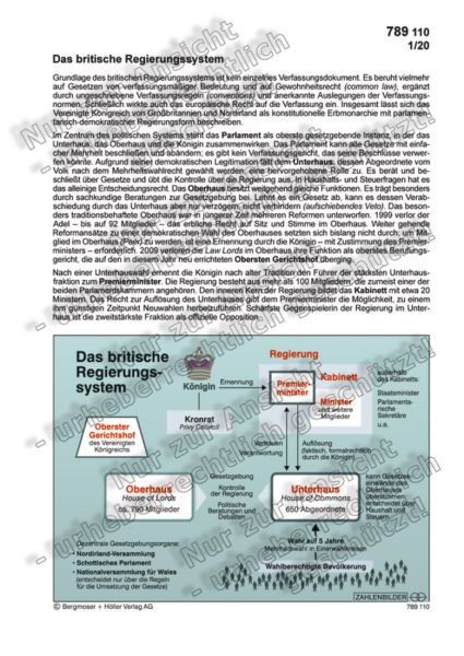 Grundlage des britischen Regierungssystems ist kein einzelnes Verfassungsdokument. Es beruht vielmehr auf Gesetzen von verfassungsmäßiger Bedeutung und auf Gewohnheitsrecht (common law), ergänzt durch ungeschriebene Verfassungsregeln (conventions) und anerkannte Auslegungen der Verfassungsnormen. Schließlich wirkte auch das europäische Recht auf die Verfassung ein. Insgesamt lässt sich das Vereinigte Königreich von Großbritannien und Nordirland als konstitutionelle Erbmonarchie mit parlamentarisch- demokratischer Regierungsform beschreiben.