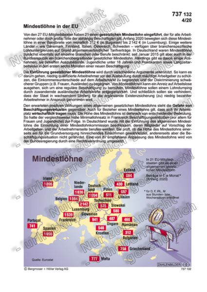 Von den 27 Mitgliedstaaten der Europäischen Union haben 22 einen gesetzlichen Mindestlohn eingeführt, der für alle Arbeitnehmer oder doch große Teile der abhängig Beschäftigten gilt. Anfang 2024 überspannten diese Mindestlöhne eine Bandbreite von monatlich 477 € (in Bulgarien) bis 2 571 € (in Luxemburg). Die übrigen Länder – Dänemark, Finnland, Italien, Österreich und Schweden – verfügen über branchenspezifische Lohnuntergrenzen aufgrund allgemeinverbindlicher Tarifverträge. In Deutschland waren Mindestlöhne zunächst ebenfalls auf einzelne Branchen oder Berufe beschränkt. Seit Januar 2015 gilt aber auch in der Bundesrepublik ein branchenübergreifender gesetzlicher Mindestlohn. Davon gibt es allerdings einige Ausnahmen; sie betreffen Auszubildende, Jugendliche unter 18 Jahren und Praktikanten sowie Langzeitarbeitslose in den ersten sechs Monaten einer neuen Beschäftigung. Und nach wie vor haben tarifvertraglich vereinbarte und vom Bundesarbeitsministerium für allgemeinverbindlich erklärte Mindestlöhne einzelner Branchen und Berufe Vorrang vor dem (niedrigeren) gesetzlichen Mindestlohn.
