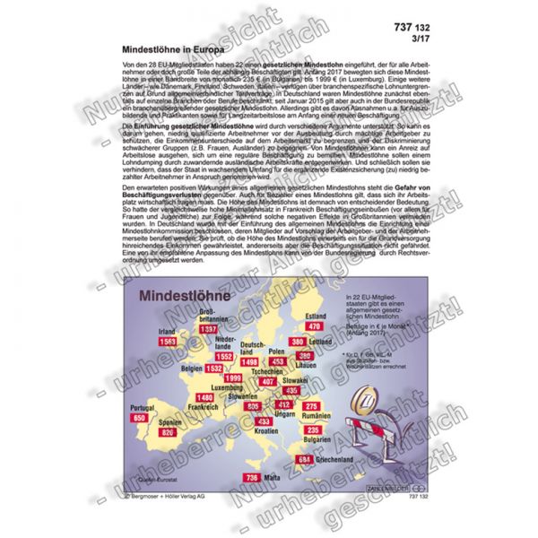Von den 27 Mitgliedstaaten der Europäischen Union haben 22 einen gesetzlichen Mindestlohn eingeführt, der für alle Arbeitnehmer oder doch große Teile der abhängig Beschäftigten gilt. Anfang 2024 überspannten diese Mindestlöhne eine Bandbreite von monatlich 477 € (in Bulgarien) bis 2 571 € (in Luxemburg). Die übrigen Länder – Dänemark, Finnland, Italien, Österreich und Schweden – verfügen über branchenspezifische Lohnuntergrenzen aufgrund allgemeinverbindlicher Tarifverträge. In Deutschland waren Mindestlöhne zunächst ebenfalls auf einzelne Branchen oder Berufe beschränkt. Seit Januar 2015 gilt aber auch in der Bundesrepublik ein branchenübergreifender gesetzlicher Mindestlohn. Davon gibt es allerdings einige Ausnahmen; sie betreffen Auszubildende, Jugendliche unter 18 Jahren und Praktikanten sowie Langzeitarbeitslose in den ersten sechs Monaten einer neuen Beschäftigung. Und nach wie vor haben tarifvertraglich vereinbarte und vom Bundesarbeitsministerium für allgemeinverbindlich erklärte Mindestlöhne einzelner Branchen und Berufe Vorrang vor dem (niedrigeren) gesetzlichen Mindestlohn.