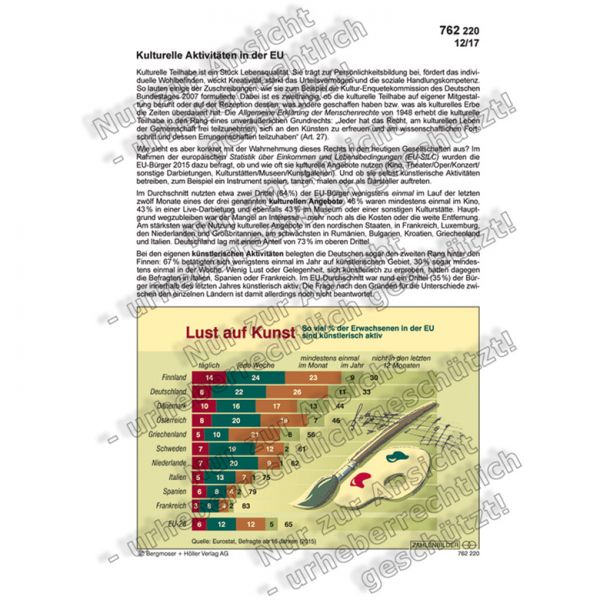 Wie sieht es aber konkret mit der Wahrnehmung dieses Rechts in den heutigen Gesellschaften aus? Im Rahmen der europäischen Statistik über Einkommen und Lebensbedingungen (EU-SILC) wurden die EU-Bürger 2015 dazu befragt, ob und wie oft sie kulturelle Angebote nutzen (Kino, Theater/Oper/Konzert/sonstige Darbietungen, Kulturstätten/Museen/Kunstgalerien). Und ob sie selbst künstlerische Aktivitäten betreiben, zum Beispiel ein Instrument spielen, tanzen, malen oder als Darsteller auftreten.
