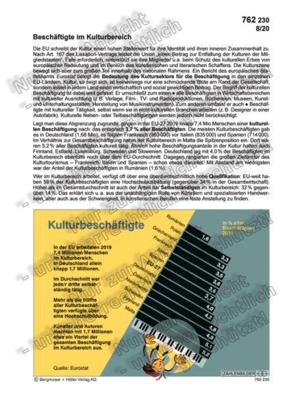 Legt man diese Abgrenzung zugrunde, gingen in der EU-27 2019 knapp 7,4 Mio Menschen einer kulturellen Beschäftigung nach; das entsprach 3,7 % aller Beschäftigten. Die meisten Kulturbeschäftigten gab es in Deutschland (1,68 Mio); es folgten Frankreich (963 000) vor Italien (835 000) und Spanien (714 000). Im Verhältnis zur Gesamtbeschäftigung nahm der Kulturbereich in Malta die Spitzenposition ein. Dort waren 5,2 % aller Beschäftigten kulturell tätig. Ähnlich hohe Beschäftigungsanteile in der Kultur hatten auch Finnland, Estland, Luxemburg, Schweden und Slowenien. Deutschland lag mit 4,0 % der Beschäftigten im Kulturbereich ebenfalls noch über dem EU-Durchschnitt. Dagegen rangierten die großen Zielländer des Kulturtourismus – Frankreich, Italien und Spanien – schon etwas darunter. Mit Abstand am niedrigsten war der Anteil der Kulturbeschäftigten in Rumänien (1,6 %).