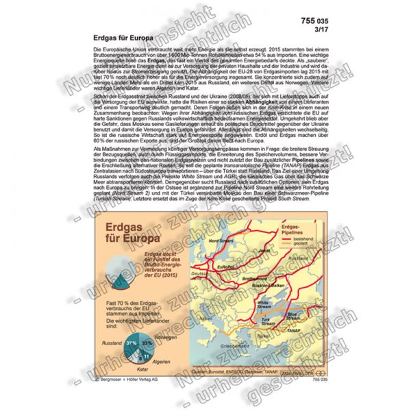 Die Europäische Union verbraucht weit mehr Energie als sie selbst erzeugt. 2020 stammten bei einem Bruttoenergieverbrauch von rund 1 400 Mio Tonnen Rohöleinheiten etwa 57 % aus Importen. Eine wichtige Energiequelle ist das Erdgas, das ein Fünftel des gesamten Energieverbrauchs der EU deckt. Als „saubere“, gezielt einsetzbare Energie dient es zur Versorgung der privaten Haushalte und der Industrie und wird zur Stromerzeugung genutzt. Die Abhängigkeit der EU-27 von Erdgasimporten lag 2020 mit über 80 % noch deutlich höher als für die Energieversorgung insgesamt. Sie konzentrierte sich zudem auf wenige Länder: 38 % der Erdgaseinfuhren kamen aus Russland, 19 % aus Norwegen. Weitere wichtige Lieferländer waren Algerien und Katar, in jüngerer Zeit kamen auch die USA als bedeutender Lieferant hinzu.
