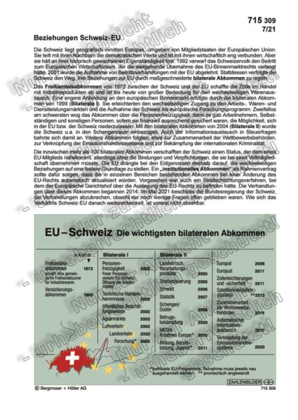 Die Schweiz liegt geografisch inmitten Europas, umgeben von Mitgliedstaaten der Europäischen Union. Sie teilt mit ihren Nachbarn die demokratischen Werte und ist mit ihnen wirtschaftlich eng verbunden. Aber sie hält an ihrer historisch gewachsenen Eigenständigkeit fest. 1992 verwarf das Schweizervolk den Beitritt zum Europäischen Wirtschaftsraum, der die weitgehende Übernahme des EU-Binnenmarktrechts verlangt hätte. 2001 wurde die Aufnahme von Beitrittsverhandlungen mit der EU abgelehnt. Stattdessen verfolgte die Schweiz den Weg, ihre Beziehungen zur EU durch maßgeschneiderte bilaterale Abkommen zu regeln.