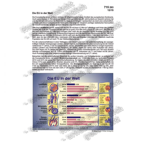 Die Europäische Union umfasst mit ihren 27 Mitgliedstaaten einen großen Teil des europäischen Kontinents. Zwar hat Europa im Verhältnis zur übrigen Welt seit Mitte des 20. Jahrhunderts an Gewicht verloren und die EU tut sich schwer damit, ihr Potenzial zur Geltung zu bringen, auch bedeutete der Austritt Großbritanniens einen schweren Rückschlag für die europäische Einigung. Aber die EU repräsentiert doch eine wirtschaftlich, politisch und sozial hochentwickelte Weltregion. Das zeigt ein Vergleich wichtiger statistischer Kennzahlen mit denen anderer großer Industrie- und Schwellenländer.