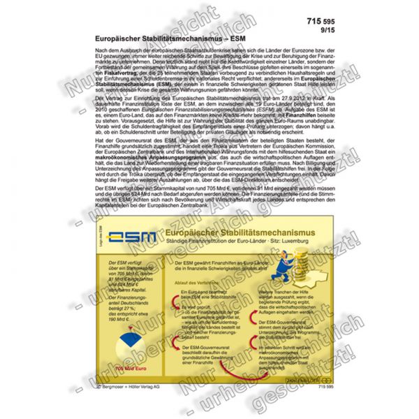 er Vertrag zur Einrichtung des Europäischen Stabilitätsmechanismus trat am 27.9.2012 in Kraft. Als dauerhafte Finanzinstitution löste der ESM, an dem inzwischen alle 19 Euro-Länder beteiligt sind, den 2010 geschaffenen Europäischen Finanzstabilisierungsmechanismus (ESFM) ab. Aufgabe des ESM ist es, einem Euro-Land, das auf den Finanzmärkten keine Kredite mehr bekommt, mit Finanzhilfen beiseite zu stehen. Vorausgesetzt, die Hilfe ist zur Wahrung der Stabilität des ganzen Euro-Raums unabdingbar. Vorab wird die Schuldentragfähigkeit des Empfängerstaats einer Prüfung unterzogen; davon hängt u.a. ab, ob ein Schuldenschnitt unter Beteiligung der privaten Gläubiger als notwendig erscheint.