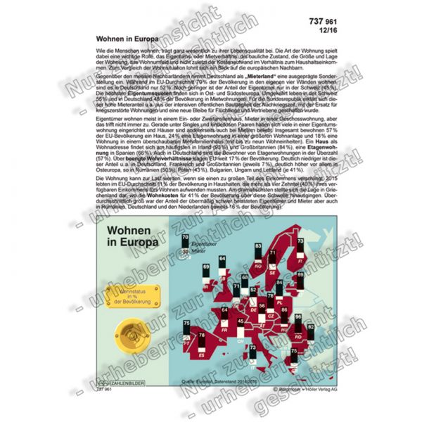 Wie die Menschen wohnen, trägt ganz entscheidend zu ihrer Lebensqualität bei. Die Art der Wohnung spielt dabei eine wichtige Rolle, das Eigentums- oder Mietverhältnis, der bauliche Zustand, die Größe und Lage der Wohnung, das Wohnumfeld und nicht zuletzt die Wohnkosten im Verhältnis zum Haushaltseinkommen. Zum Vergleich der Wohnsituation lohnt sich ein Blick auf die europäischen Nachbarn.