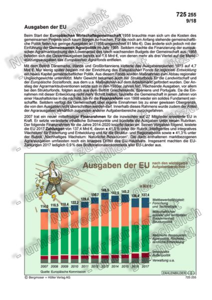 2007 trat ein neuer mittelfristiger Finanzrahmen für die inzwischen auf 27 Mitglieder erweiterte EU in Kraft. Er setzte veränderte inhaltliche Schwerpunkte und bündelte die Ausgaben unter neuen Rubriken. Der folgende Finanzrahmen für die Jahre 2014-2020 knüpfte daran an. Seinen Vorgaben folgend, leistete die EU 2017 Zahlungen von 137,4 Mrd €, davon • 41,5 % unter der Rubrik „Intelligentes und integratives Wachstum“ für Forschung und Entwicklung und für die Struktur- und Regionalpolitik sowie • 41,3 % unter der Rubrik „Nachhaltiges Wachstum: Natürliche Ressourcen“. Die darin enthaltenen marktbezogenen Agrarausgaben umfassten noch ein knappes Drittel des EU-Haushalts. Insgesamt machten die EU-Zahlungen 2017 lediglich 0,9 % des Bruttonationaleinkommens aller EU-Länder aus.