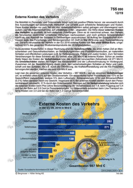 Die Mobilität im Personen- und Güterverkehr bringt nicht nur positive Effekte hervor; sie verursacht durch ihre Auswirkungen auf Gesellschaft, Wirtschaft und Umwelt auch erhebliche Belastungen und Kosten. Diese Kosten werden nur zum Teil von den Verkehrsteilnehmern selbst getragen und überwiegend nach außen – auf die Allgemeinheit bzw. auf unbeteiligte Dritte – abgewälzt. Die Höhe dieser externen Kosten des Verkehrs zu ermitteln, ist kein einfaches Unterfangen. Denn es ist manchmal schwer, den Verkehr als Verursacher bestimmter schädlicher Wirkungen nachzuweisen; und noch größere Schwierigkeiten macht es, das Ausmaß der Schäden in Geldbeträgen auszudrücken. Im Auftrag der Europäischen Kommission legte das Forschungs- und Beratungsinstitut CE Delft im Mai 2019 eine neue Kostenschätzung vor. Danach verursachte der Verkehr in der EU 2016 externe Kosten von fast einer Billion Euro, umgerechnet 6,6 % des gesamten Bruttoinlandsprodukts der 28 Mitgliedstaaten.