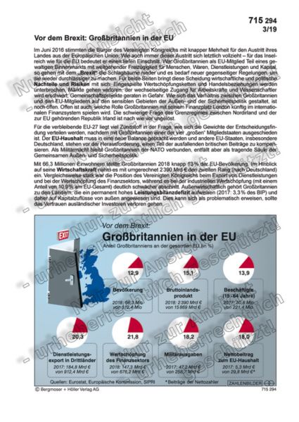 Mit 66,3 Millionen Einwohnern stellte Großbritannien 2018 knapp 13 % der EU-Bevölkerung. Im Hinblick auf seine Wirtschaftskraft nahm es mit umgerechnet 2 390 Mrd € den zweiten Rang (nach Deutschland) ein. Vergleichsweise stark war die Position des Vereinigten Königreichs beim Export von Dienstleistungen und bei der Wertschöpfung des Finanzsektors, während es bei der industriellen Wertschöpfung (mit einem Anteil von 10,9 % am EU-Gesamt) deutlich schwächer abschnitt. Außenwirtschaftlich gehört Großbritannien zu den Ländern, die ein permanent hohes Leistungsbilanzdefizit aufweisen (2017: 3,3 % des BIP) und daher auf Kapitalzuflüsse von außen angewiesen sind. Dies kann sich als problematisch erweisen, sollte das Vertrauen ausländischer Investoren verloren gehen.