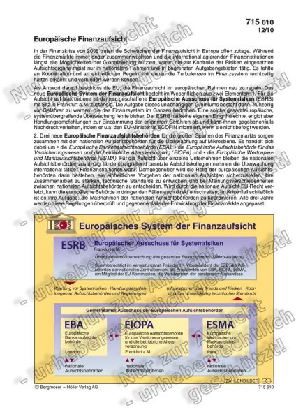 Als Antwort darauf beschloss die EU, die Finanzaufsicht im europäischen Rahmen neu zu regeln. Das neue Europäische System der Finanzaufsicht besteht im Wesentlichen aus zwei Elementen: 1. Für die Aufsicht auf Makroebene ist der neu geschaffene Europäische Ausschuss für Systemrisiken (ESRB) mit Sitz in Frankfurt a.M. zuständig. Die Aufgabe dieses unabhängigen Gremiums besteht darin, frühzeitig vor Gefahren zu warnen, die das Finanzsystem im Ganzen bedrohen. Eine solche gesamteuropäische, systemübergreifende Überwachung fehlte bisher. Der ESRB hat keine eigenen Eingriffsrechte; er gibt aber Handlungsempfehlungen zur Eindämmung der erkannten Gefahren ab und kann ihnen gegebenenfalls Nachdruck verleihen, indem er u.a. den EU-Ministerrat ECOFIN informiert, wenn sie nicht befolgt werden.