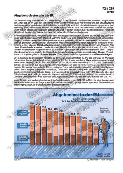 2018 machten die öffentlichen Abgaben in der EU-28 durchschnittlich 40,3 % des BIP aus. Im Vergleich mit anderen hochentwickelten Ländern weist die EU damit eine sehr hohe Abgabenbelastung auf – weit höher als in Japan (2016: 30,6%), der Schweiz (2018: 28,1%) oder den USA (2017: 27,1%). Diese Unterschiede erklären sich aus abweichenden Grundauffassungen über die Rolle des Staates und den Umfang sozialer Sicherung. Innerhalb der EU verzeichnete Frankreich (mit 48,4 % des BIP) die höchste Abgabenquote. Auch Belgien, Dänemark, Schweden, Österreich, Finnland und Italien baten ihre Bürger in überdurchschnittlichem Ausmaß zur Kasse. In Deutschland lag die Abgabenlast mit 41,5% ebenfalls über dem EU-Mittelwert. Weit niedriger waren die Abgaben in Irland (23,0 %) und den meisten osteuropäischen EULändern. Großbritannien wies ebenfalls eine Abgabenlast unterhalb des EU-Durchschnitts auf (35,1 %).