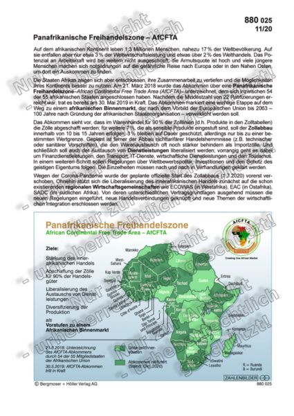 Die Staaten Afrikas zeigen sich aber entschlossen, ihre Zusammenarbeit zu vertiefen und die Möglichkeiten ihres Kontinents besser zu nutzen. Am 21. März 2018 wurde das Abkommen über eine Panafrikanische Freihandelszone – African Continental Free Trade Area (AfCFTA) – unterzeichnet, dem sich mit Ausnahme Eritreas alle afrikanischen Staaten angeschlossen haben. Nachdem die Mindestzahl von 22 Ratifizierungen erreicht war, trat es am 30. Mai 2019 in Kraft. Das Abkommen markiert eine wichtige Etappe auf dem Weg zu einem afrikanischen Binnenmarkt, der nach dem Vorbild der Europäischen Union bis 2063 – 100 Jahre nach Gründung der Afrikanischen Staatenorganisation – verwirklicht werden soll.