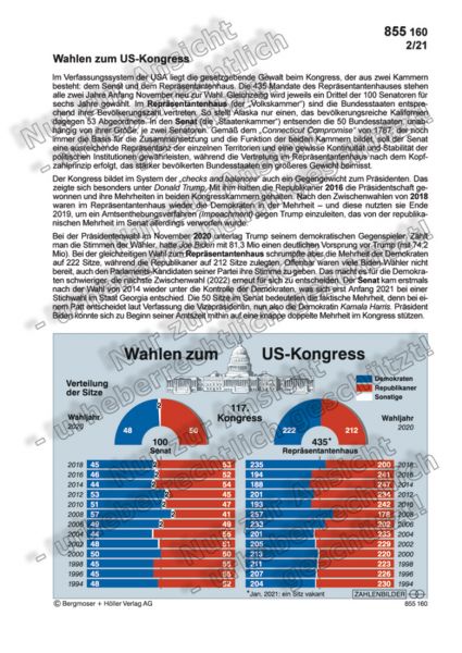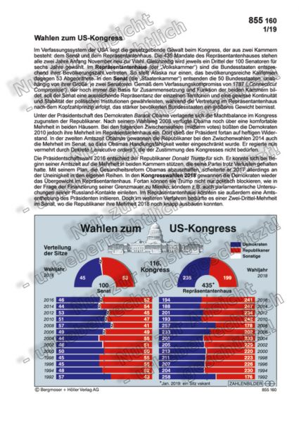 Im Verfassungssystem der USA liegt die gesetzgebende Gewalt beim Kongress, der aus zwei Kammern besteht: dem Senat und dem Repräsentantenhaus. Die 435 Mandate des Repräsentantenhauses stehen alle zwei Jahre Anfang November neu zur Wahl. Gleichzeitig wird jeweils ein Drittel der 100 Senatoren für sechs Jahre gewählt. Im Repräsentantenhaus (der „Volkskammer“) sind die Bundesstaaten entsprechend ihrer Bevölkerungszahl vertreten. So stellt Alaska nur eine/n, das bevölkerungsreiche Kalifornien dagegen 52 Abgeordnete. In den Senat (die „Staatenkammer“) entsenden die 50 Bundesstaten, unabhängig von ihrer Größe, je zwei Senatoren. Gemäß dem „Connecticut Compromise“ von 1787, der noch immer die Basis für die Zusammensetzung und die Funktion der beiden Kammern bildet, soll der Senat eine ausreichende Repräsentanz der einzelnen Territorien und eine gewisse Kontinuität und Stabilität der politischen Institutionen gewährleisten, während die Vertretung im Repräsentantenhaus nach dem Kopfzahlprinzip erfolgt, das stärker bevölkerten Bundesstaaten ein größeres Gewicht beimisst.