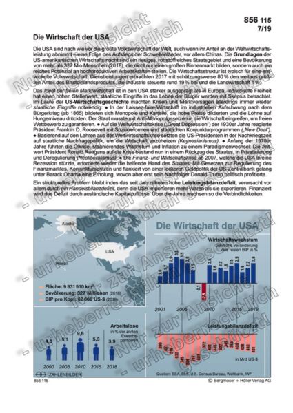Die USA sind nach wie vor die größte Volkswirtschaft der Welt, auch wenn ihr Anteil an der Weltwirtschaftsleistung abnimmt – eine Folge des Aufstiegs der Schwellenländer, vor allem Chinas. Die Grundlagen der US-amerikanischen Wirtschaftsmacht sind ein riesiges, rohstoffreiches Staatsgebiet und eine Bevölkerung von mehr als 330 Mio Menschen (2021), die nicht nur einen großen Binnenmarkt bilden, sondern auch ein reiches Potenzial an hochproduktiven Arbeitskräften stellen.