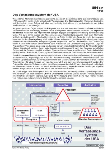 Wesentliches Merkmal des Regierungssystems, das durch die amerikanische Bundesverfassung von 1787 geschaffen wurde, ist die weitgehende Trennung der drei Staatsgewalten (Exekutive, Legislative und Judikative), deren Träger sich aber wechselseitig kontrollieren und ausbalancieren, um jedem Machtmissbrauch vorzubeugen.